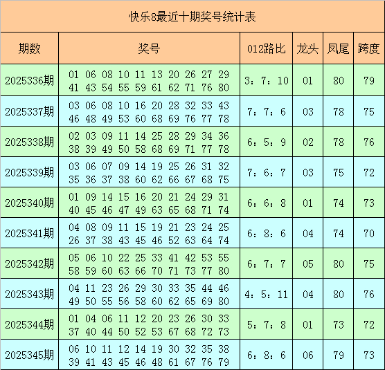 欢腾8第2025345期奖号为:06 10 11 12 14 19 30 32 35 38 39 41 43 45 46 48 61 67 76 79让球网体育信息,其中奖号012路比为6:8:6,0路号码(6个):06、12、30、39、45、48,1路号码(8个):10、19、43、46、61、67、76、79,2路号码(6个):11、14、32、35、38、41。