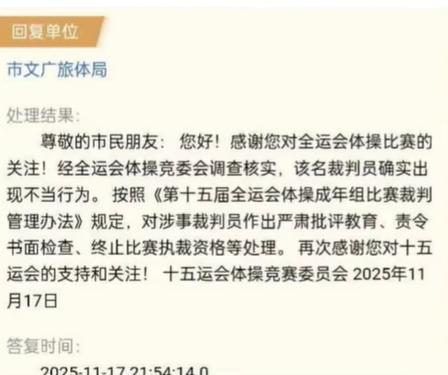 11月18日,现场不雅众告诉记者,11月17日晚,十五运会体操竞赛委员会恢复了她:该名裁判照实出现不当手脚,按照法例,对涉事评判员作出严肃月旦教师、责令书面查验、间隔比赛执裁履历等不休。