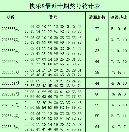 福彩昂然8第2025345期开奖回来:06 10 11 12 14 19 30 32 35 38 39 41 43 45 46 48 61 67 76 79,其中冷温热码比为4:7:9体育赛事直播,遗漏总值为64。